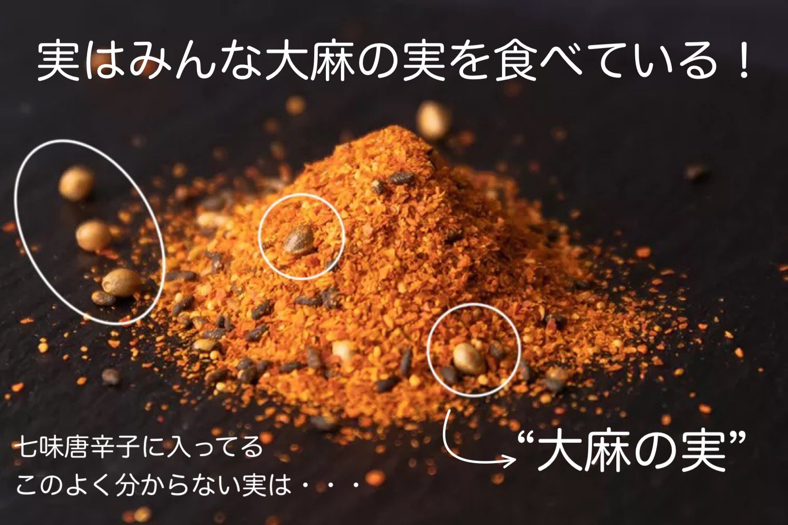 それもそのはず、大麻の実は「七味唐辛子の中」に入っていますので気付かないのも無理はありません。